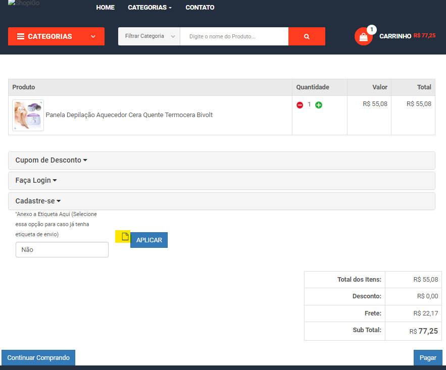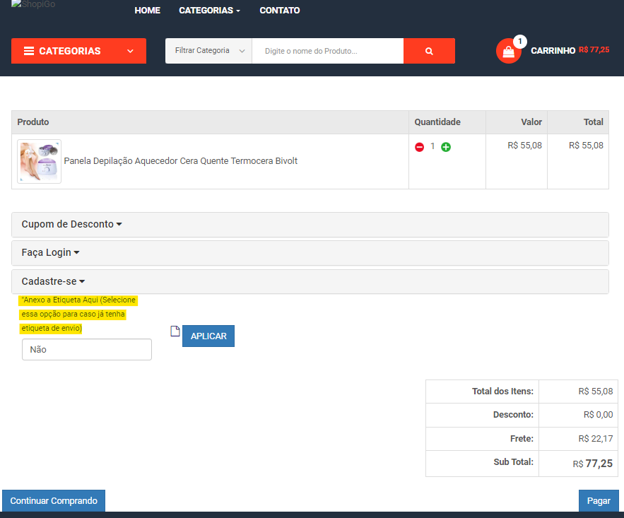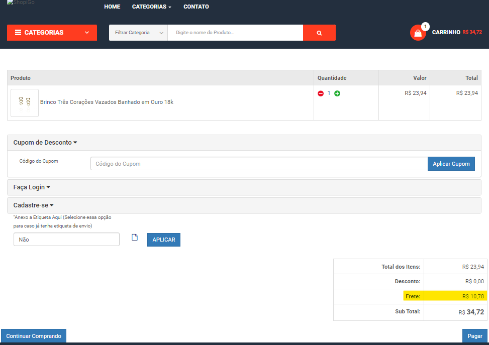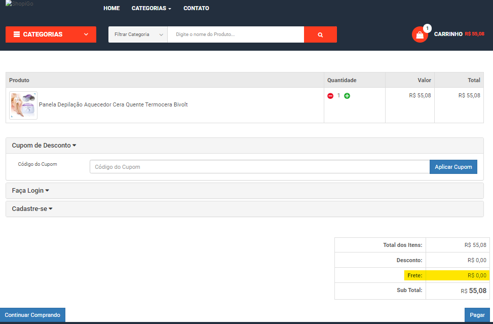 Pronto agora o frete está zerado, só efetuar o pagamento, que vamos enviar o produtos direto para a casa do seu cliente