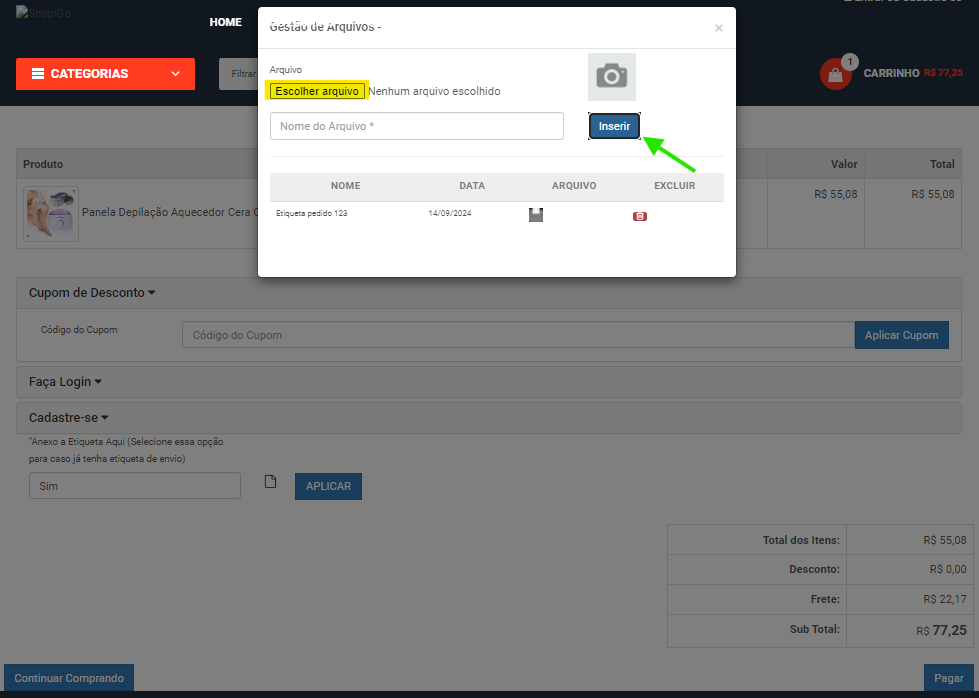 Escolha um arquivo da etiqueta tem só será aceito PDF e clique em “inserir”